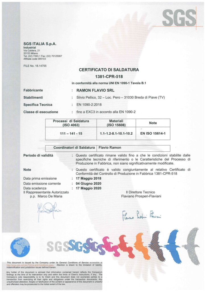 L’azienda Ramon Flavio ha ricevuto il certificato di Conformità del Controllo della Produzione in Fabbrica( EN 1090-1 CERTIFICATO N° 1381-CPR-518 ), nel quale si attesta che la realizzazione dei nostri prodotti avviene in conformità con le leggi attualmente vigenti.